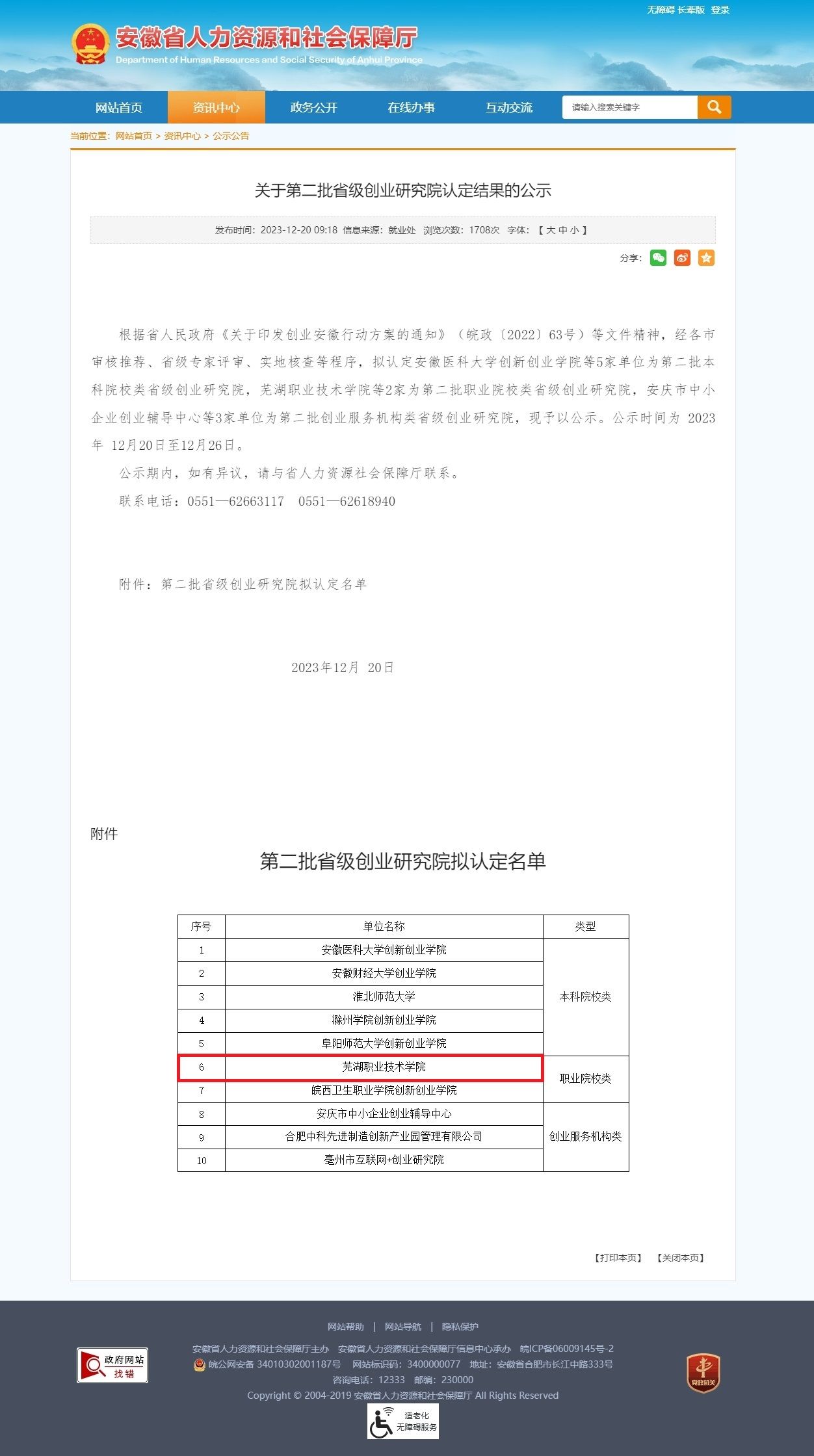日前,安徽省人力资源和社会保障厅发文,公布第二批省级创业研究院认定结果,芜湖职业技术学院成功入选。