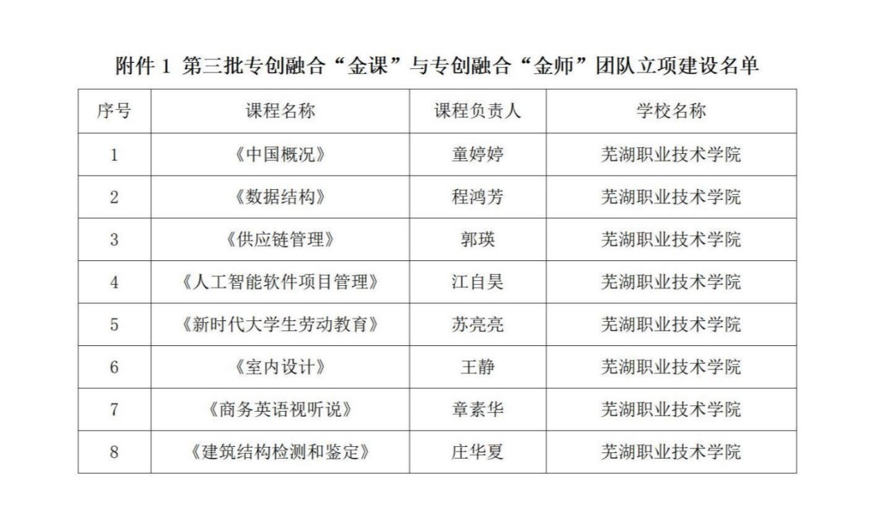 日前,全国高等职业学校校长联席会议双创教育专委会发布通知,公布第三批专创融合“金课”与专创融合“金师”团队立项建设名单,芜湖职业技术大学申报的8门课程全部成功入选。连同此前获批的前两批课程,我校已有13门课程荣登全国专创融合“金课”立项建设榜单。